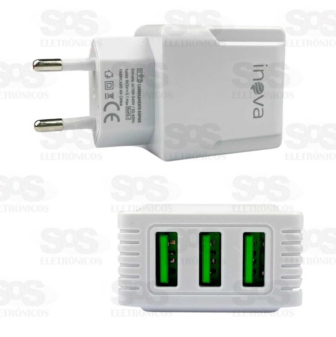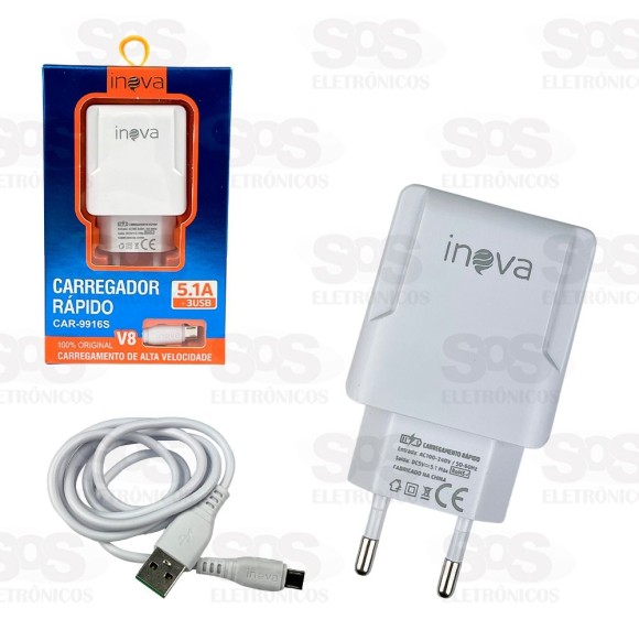 Carregador Rápido 3 USB 5.1A Com Cabo Micro USB V8 Inova CAR-9916S