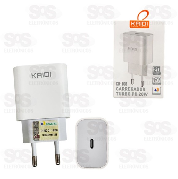 Carregador Turbo PD 20W Type-C Kaidi KD-108 Garante um carregamento rápido e estável. Conta com uma entrada PD (Type-C). Potência máxima de 20W. Cor: branco