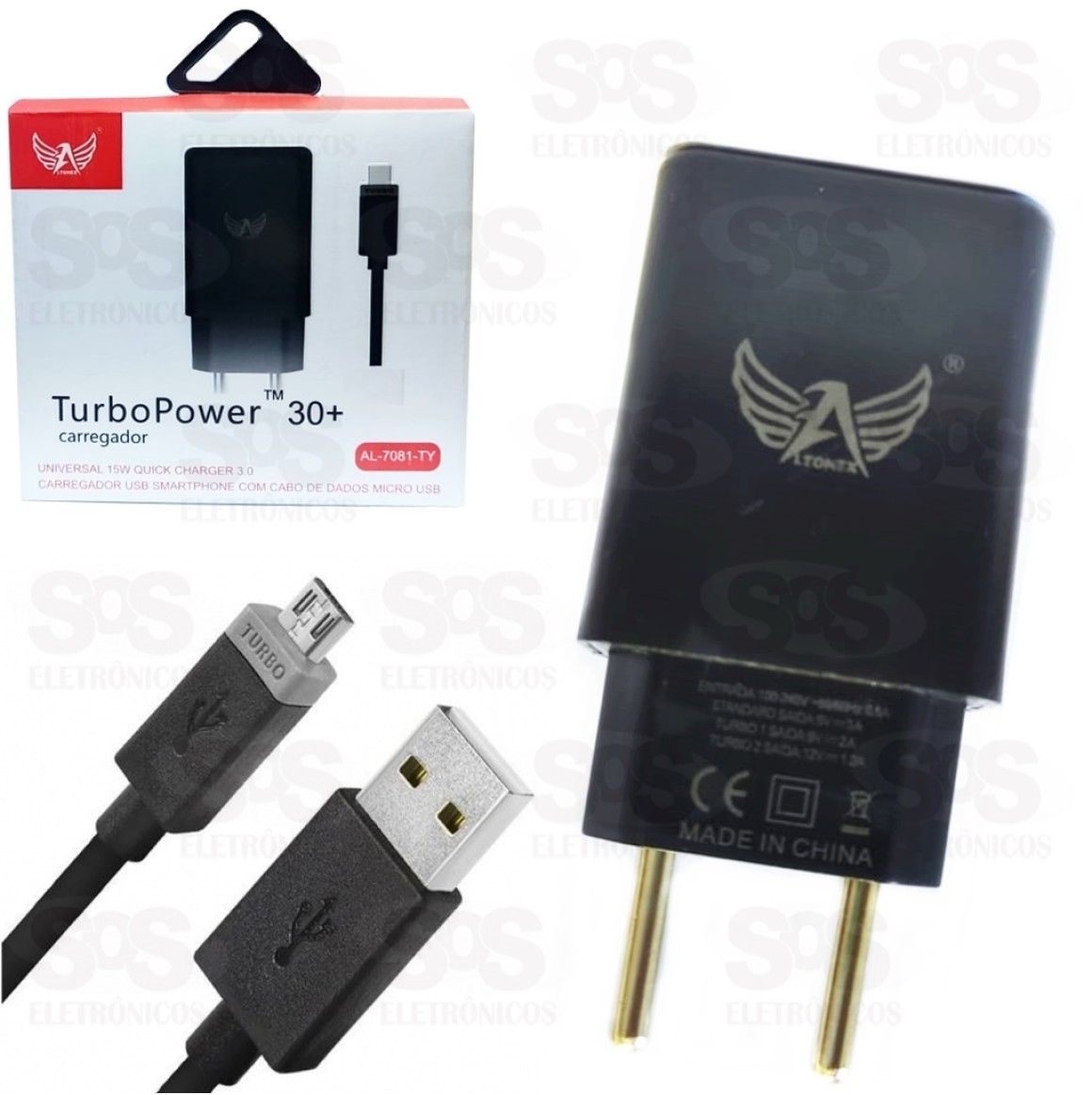 Carregador Micro USB V8 Turbo 15WAltomex AL-7081-V8Entrada 100-240 VCA 0.5A50-60 HzSaída 5V - 3A