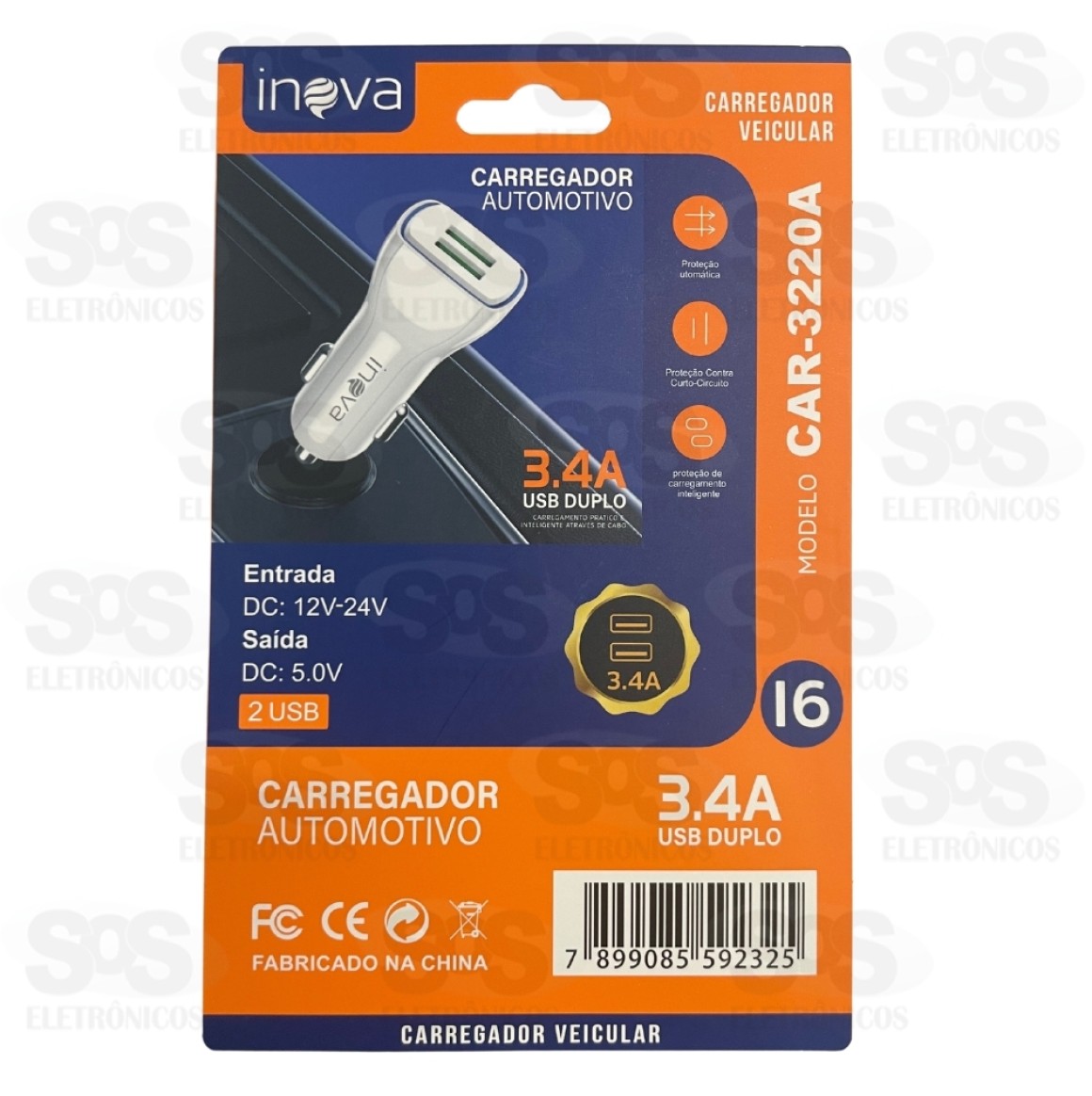 Carregador Veicular 2 USB 3.4A Com Cabo Iphone Inova CAR-3220A
