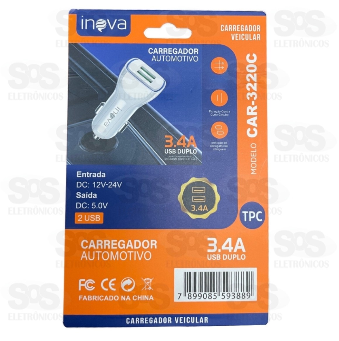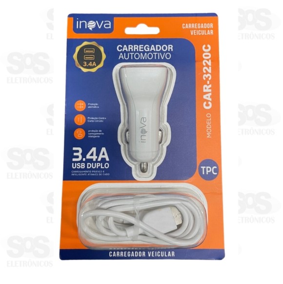 Carregador Veicular 2 USB 3.4A Com Cabo Type C Inova CAR-3220C