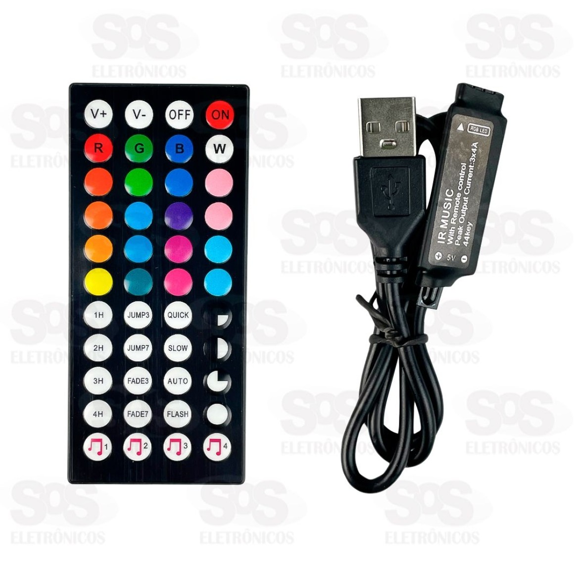 Acompanha controle remoto com várias funções, como Quick, Slow, Flash, Auto, Jump, Fade e muito mais.