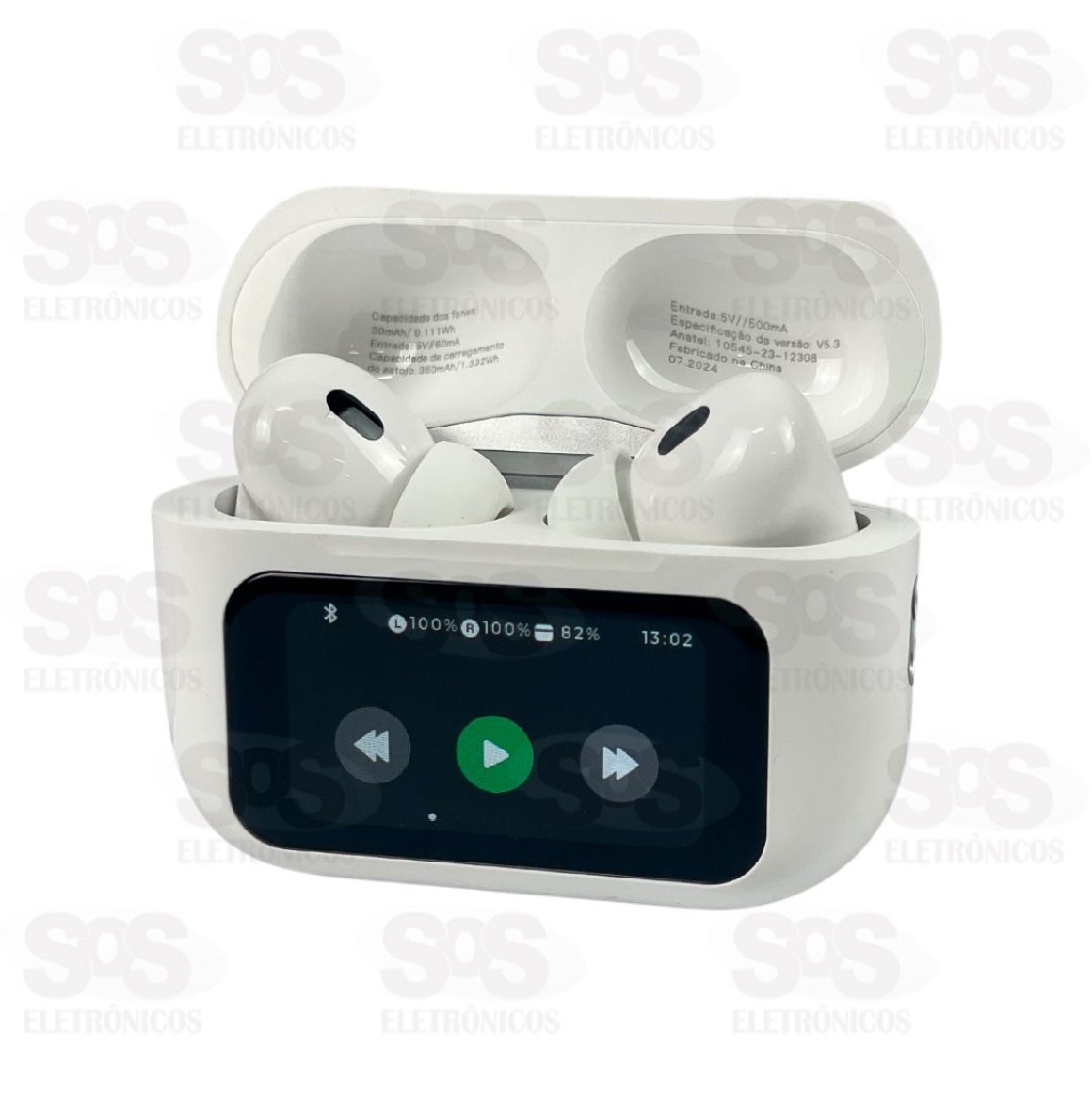 Estojo com tela touch com opções de pausa/play, trocar de música, aumentar volume, cancelamento de ruído, equalizador, encontrar os fones, data, horas e porcentagem da bateria.