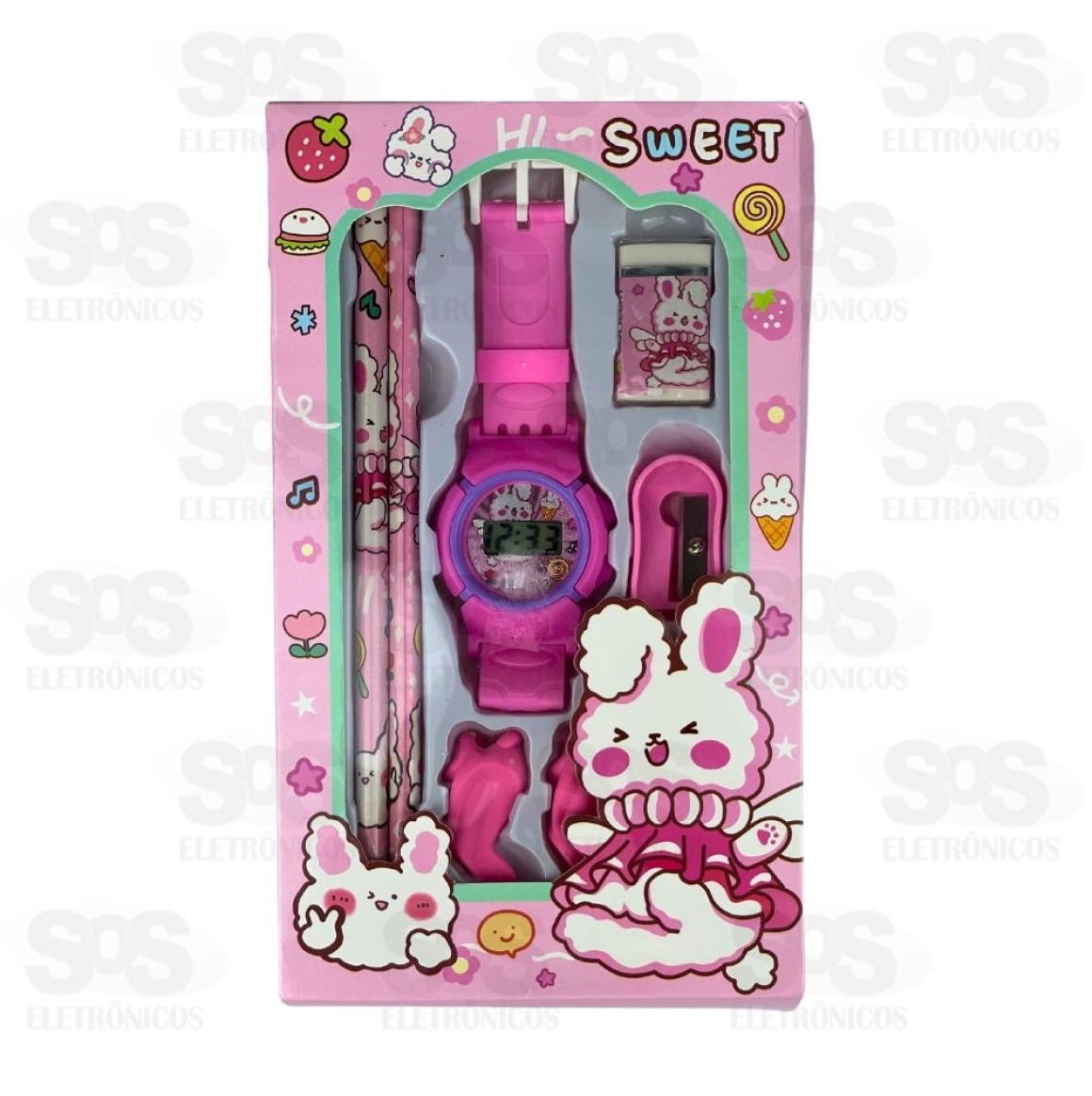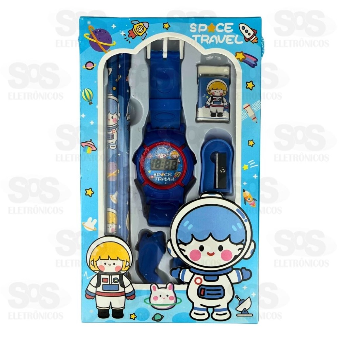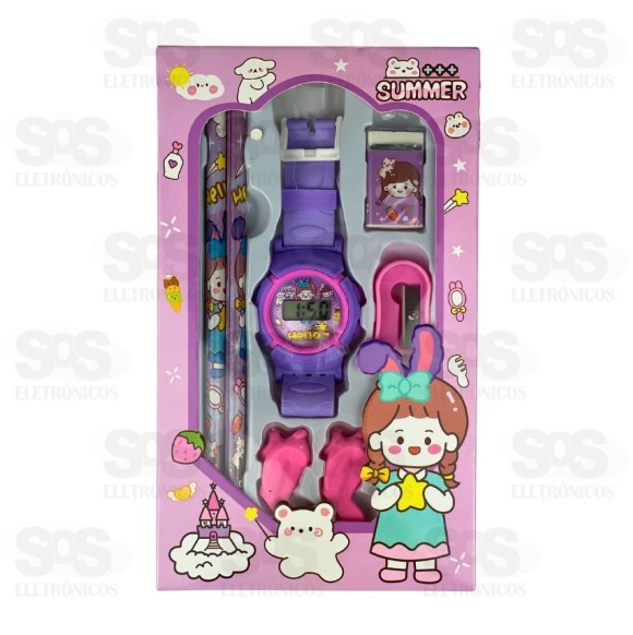 Kit Escolar 8 Peças Com Relógio Polibrinq SCB8502 Lápis01 Borracha01 Apontador01 Relógio03 Grip de lápisTamanho: 19 x 2 x 11 cmPeso: 120gCores sortidas