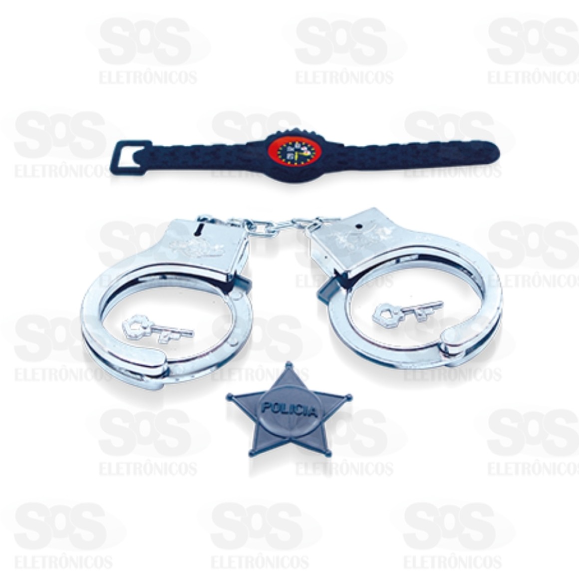 Kit Policial Algema Distintivo e Relógio Pica Pau 399 Com selo do Inmetro Não é recomendável para menores de 3 anos 01 Algema 01 Distintivo 01 Relógio Tamanho da Embalagem: (AxLxC); 23 x 1 x 24 cm
