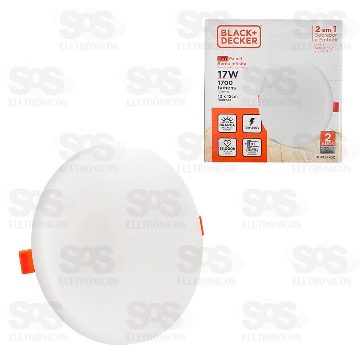 Painel Redondo Borda Infinita 2 em 1 LED Branco 17W Black+ Decker Painel redondo excelente para diversas aplicações, com seu sistema 2 em 1 que permite a instalação de embutir ou sobrepor. Oferece uma iluminação limpa, com foco fixo e direto, proporcionando maior eficiência para quem precisa de estilo, requinte e excelente iluminação. Até 80% mais econômico do que as lâmpadas comuns. Super fácil de ser instalado, pode ser colocado sobreposto em lajes ou embutidos em forros. - Potência: 17W - Temperatura de cor: 6500K - Fluxo: 1700Im - Material:Plástico e ferro - Cor: Branco frio - Ângulo de luz: 120° - Voltagem: 100V - 240V (Bivolt) - Vida útil: 15.000 horas - Tamanho: 12 cm