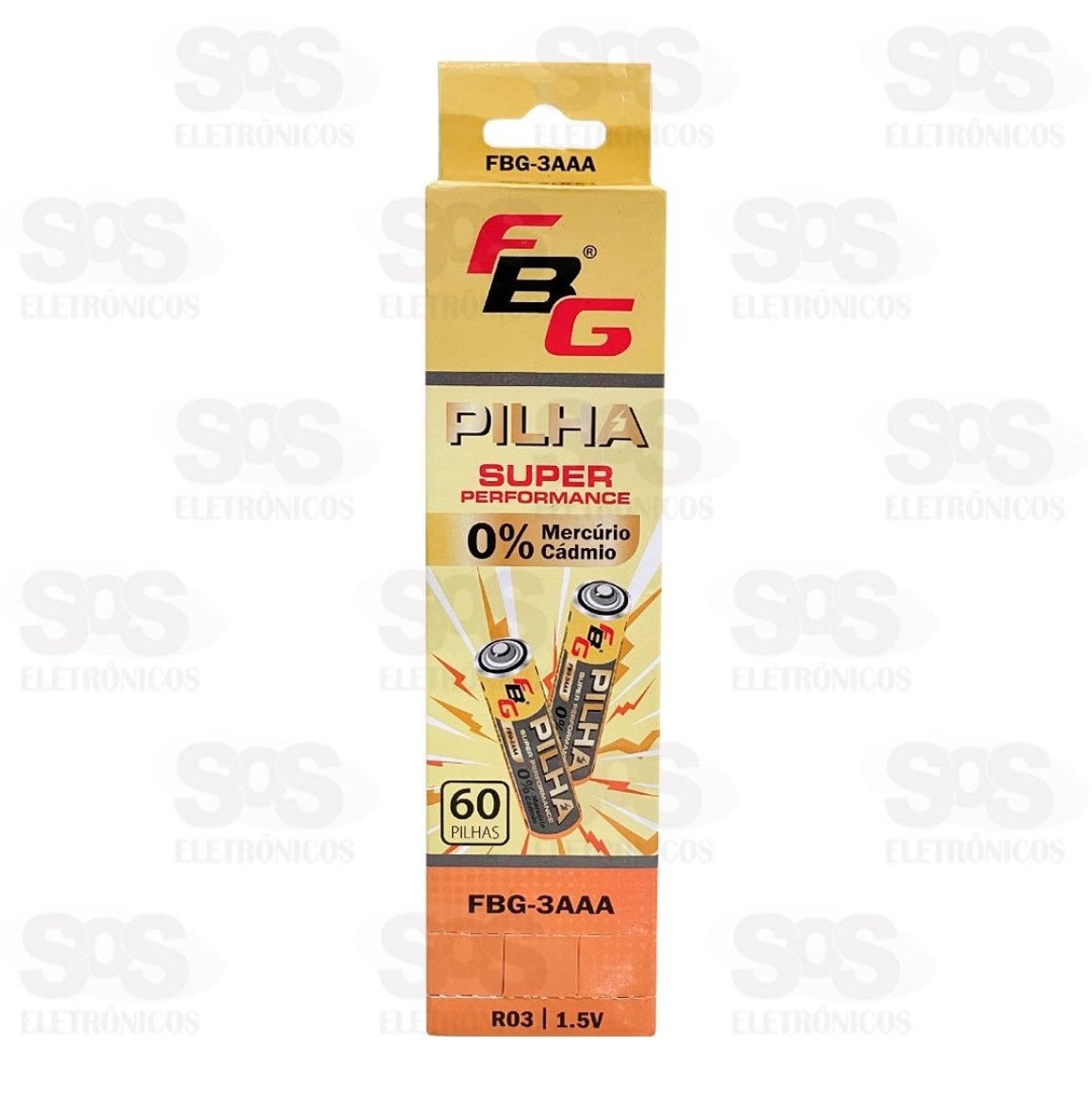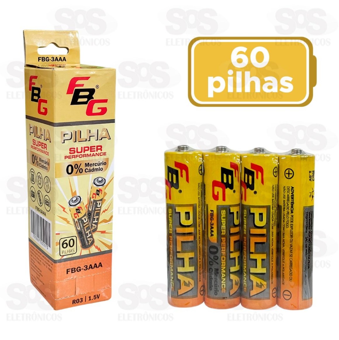 Pilhas AAA R03 1.5V Embalagem Com 60 Unidades FBG-3AAA Pilhas com super performance. 0% de mercúrio cádmio Ideal para controles remotos, calculadoras, relógios, rádios e muito mais. Caixa com 60 unidades. R03 / 1.5V