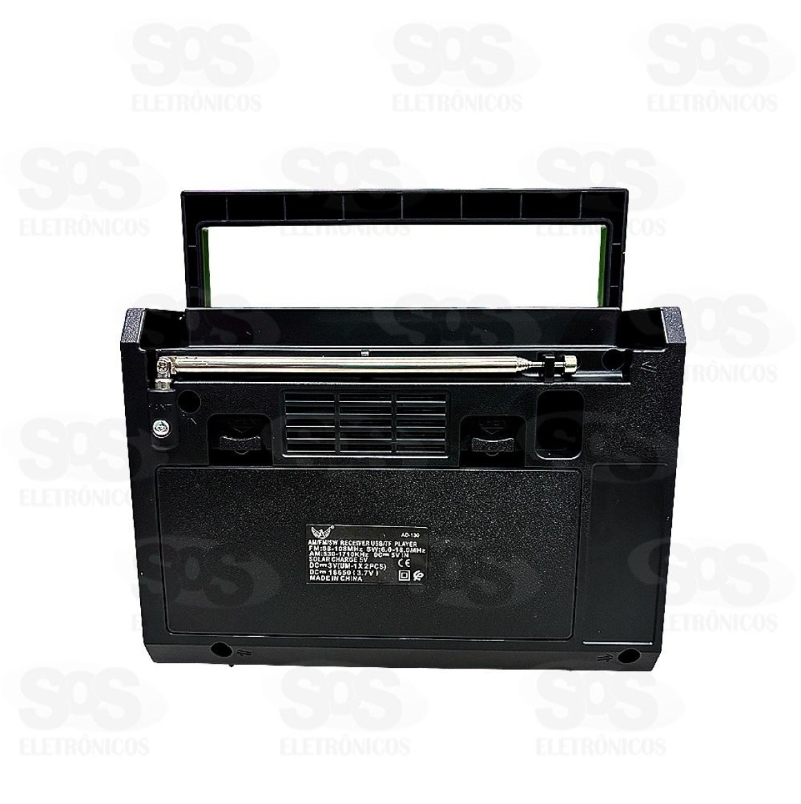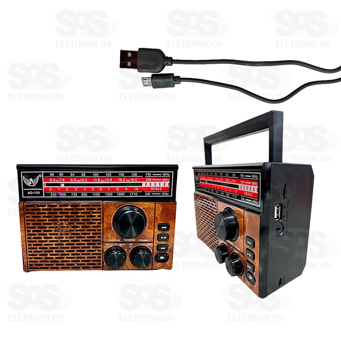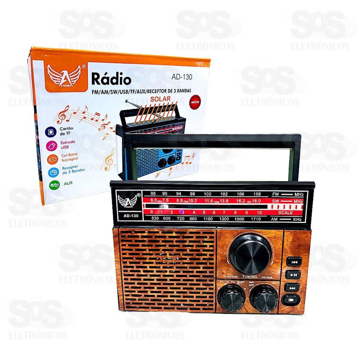 Garantia do Fornecedor: 03 meses contra defeitos de fabricação após a data da compra Rádio Retrô Bluetooth AM/FM Com Lanterna 3 Bandas Altomex AD-130 Um encantador rádio de estilo retrô com capacidade para sintonizar em três bandas diferentes: AM, FM e SW. Destaca-se pela excelente captação de sinal. Sua bateria recarregável e inclui entrada USB, leitor de cartão SD, cabo AUX e conectividade Bluetooth. Acompanha um cabo para carregamento conveniente. Inclui um cabo para recarregar sua bateria.