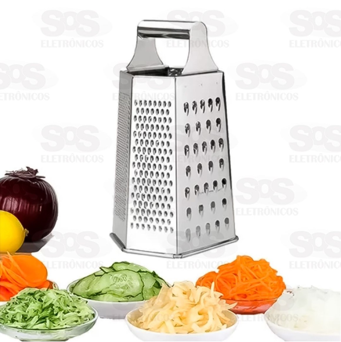 Ralador com 6 lados diferentes, é prático para ralar e fatiar legumes, queijos, chocolates e outros.