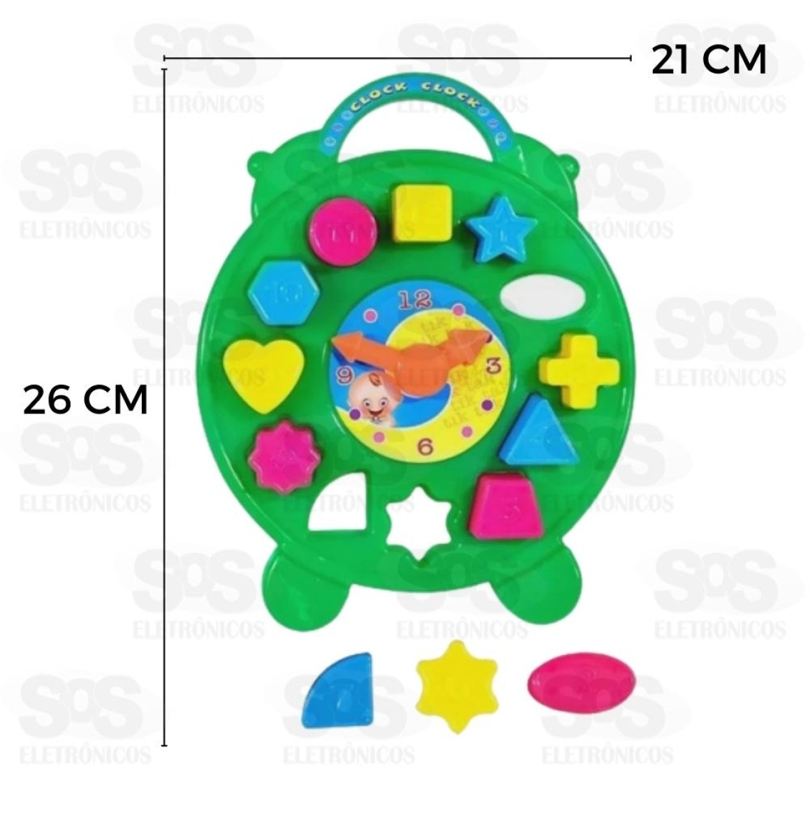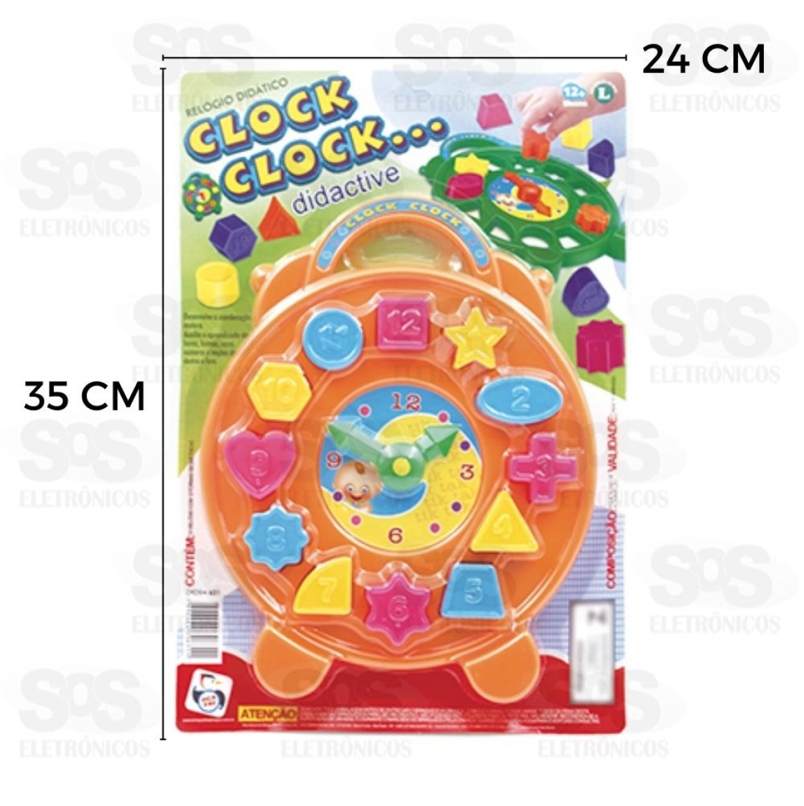 Auxilia o aprendizado das horas, formas, cores, números e noções de dentro e fora