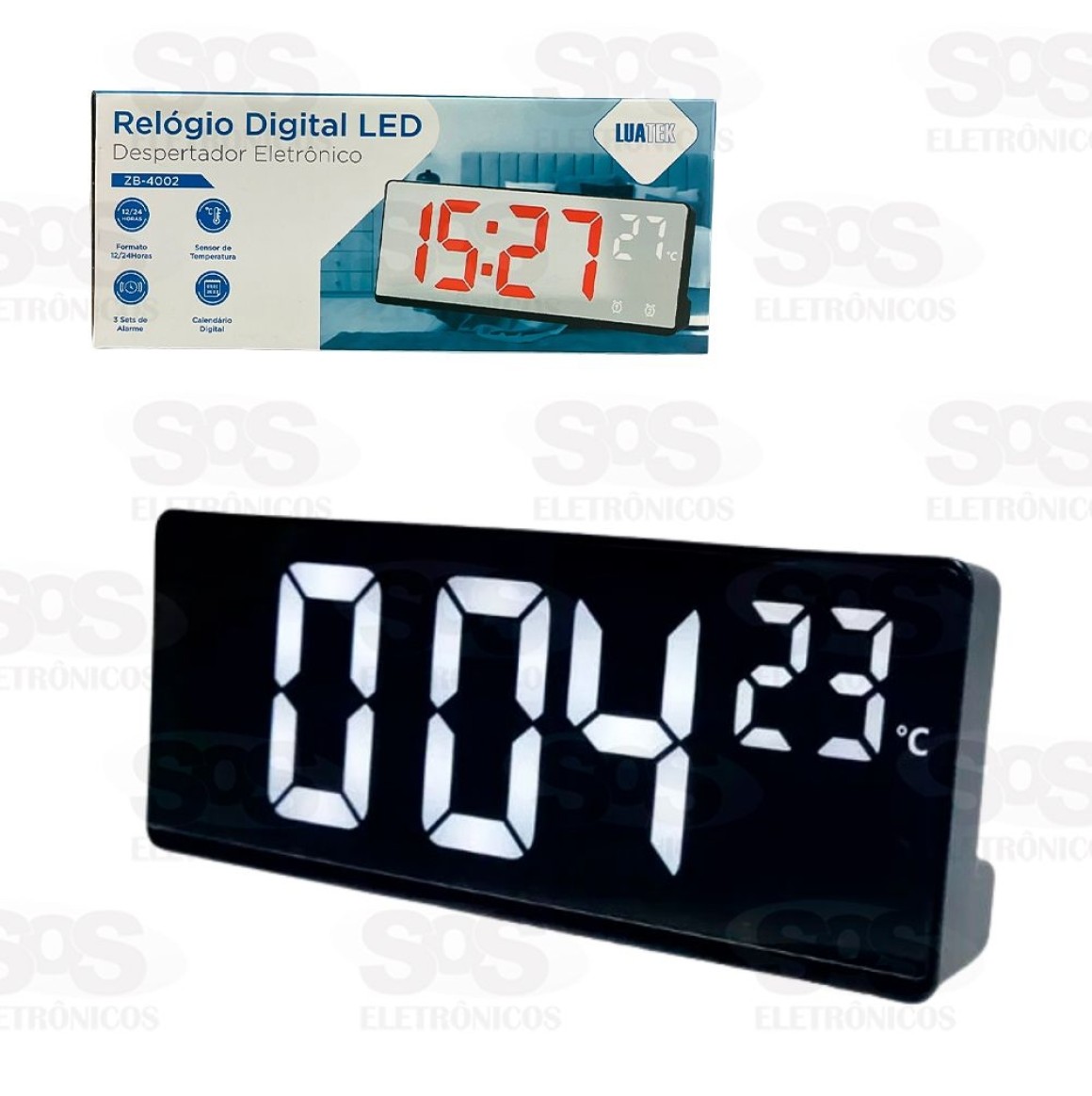 Possui formato 12/24 horas, sensor de temperatura, calendário e 3 sets de alarme.