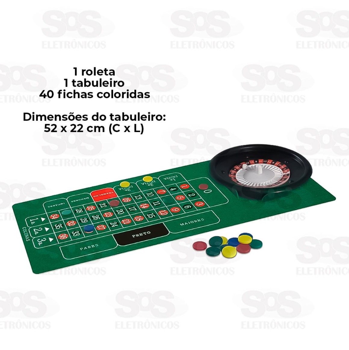 Acompanha 1 roleta, 1 tabuleiro e 40 fichas coloridas.