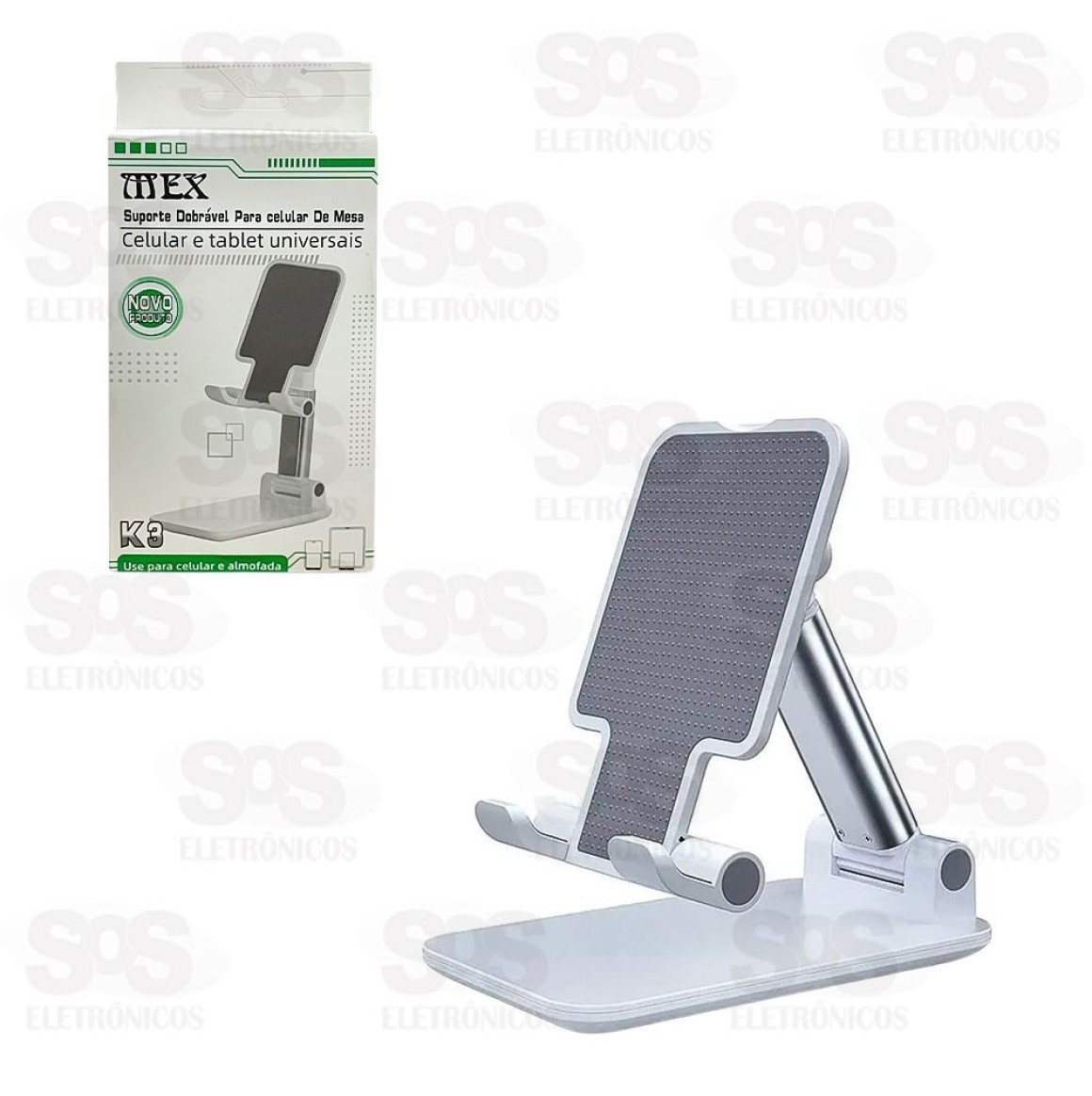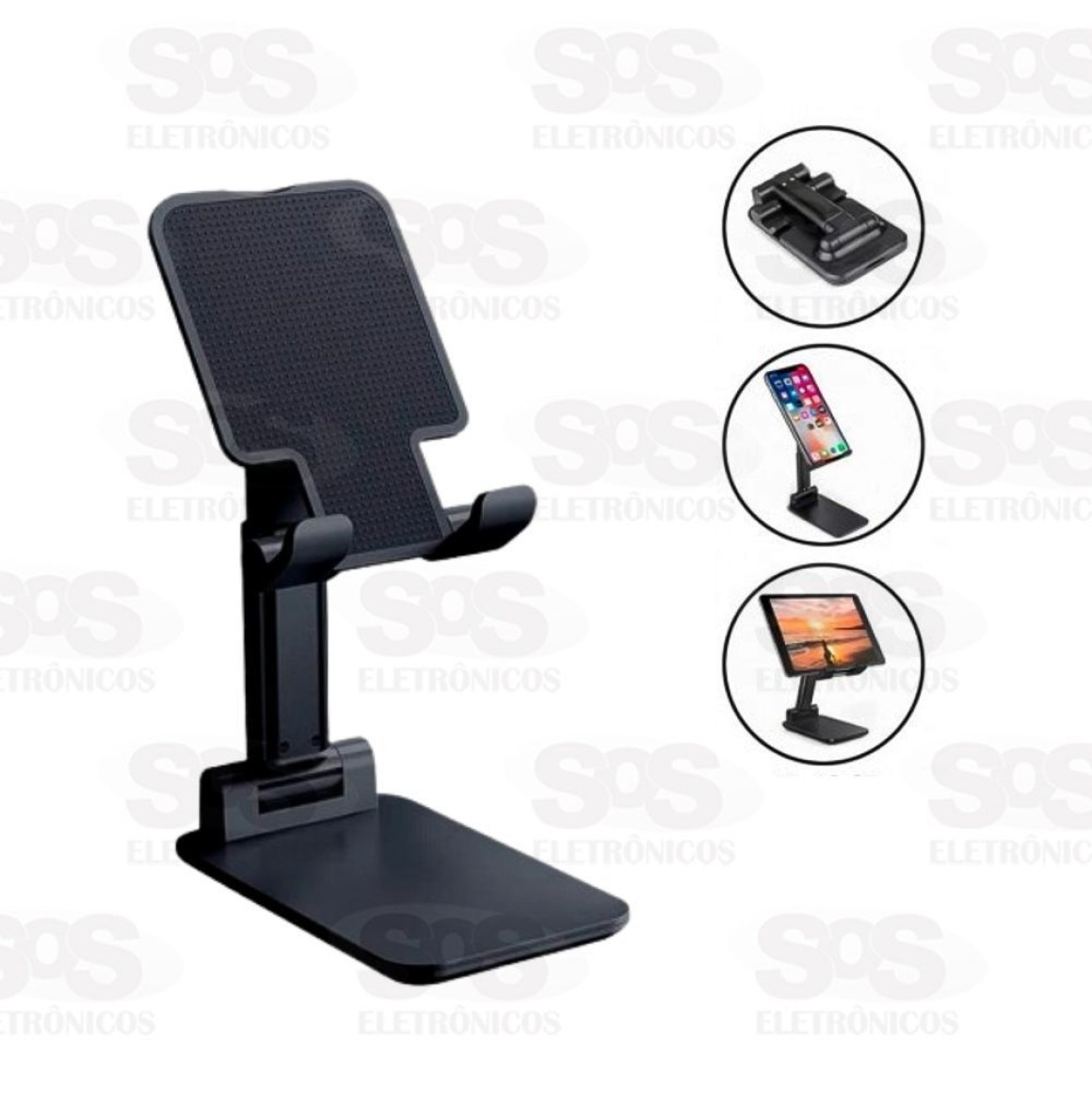 Esse suporte de mesa é compatível com tablets e smartphones.