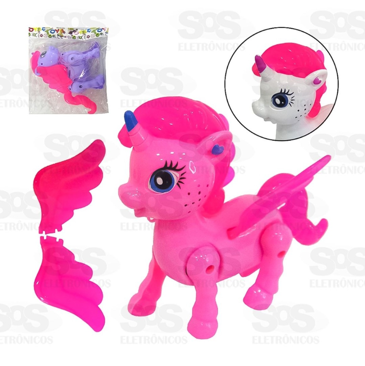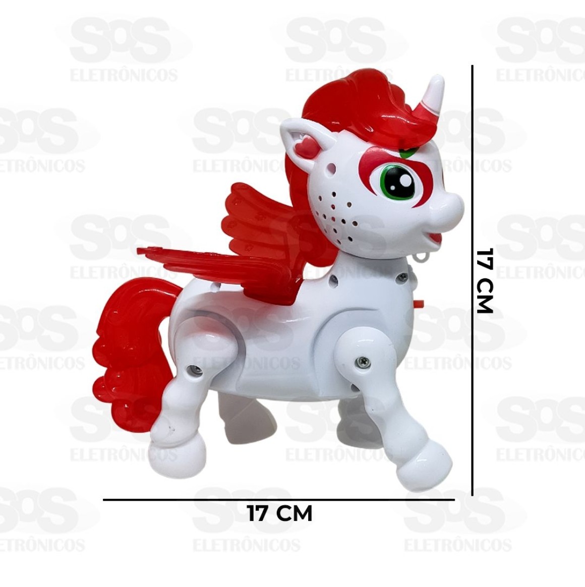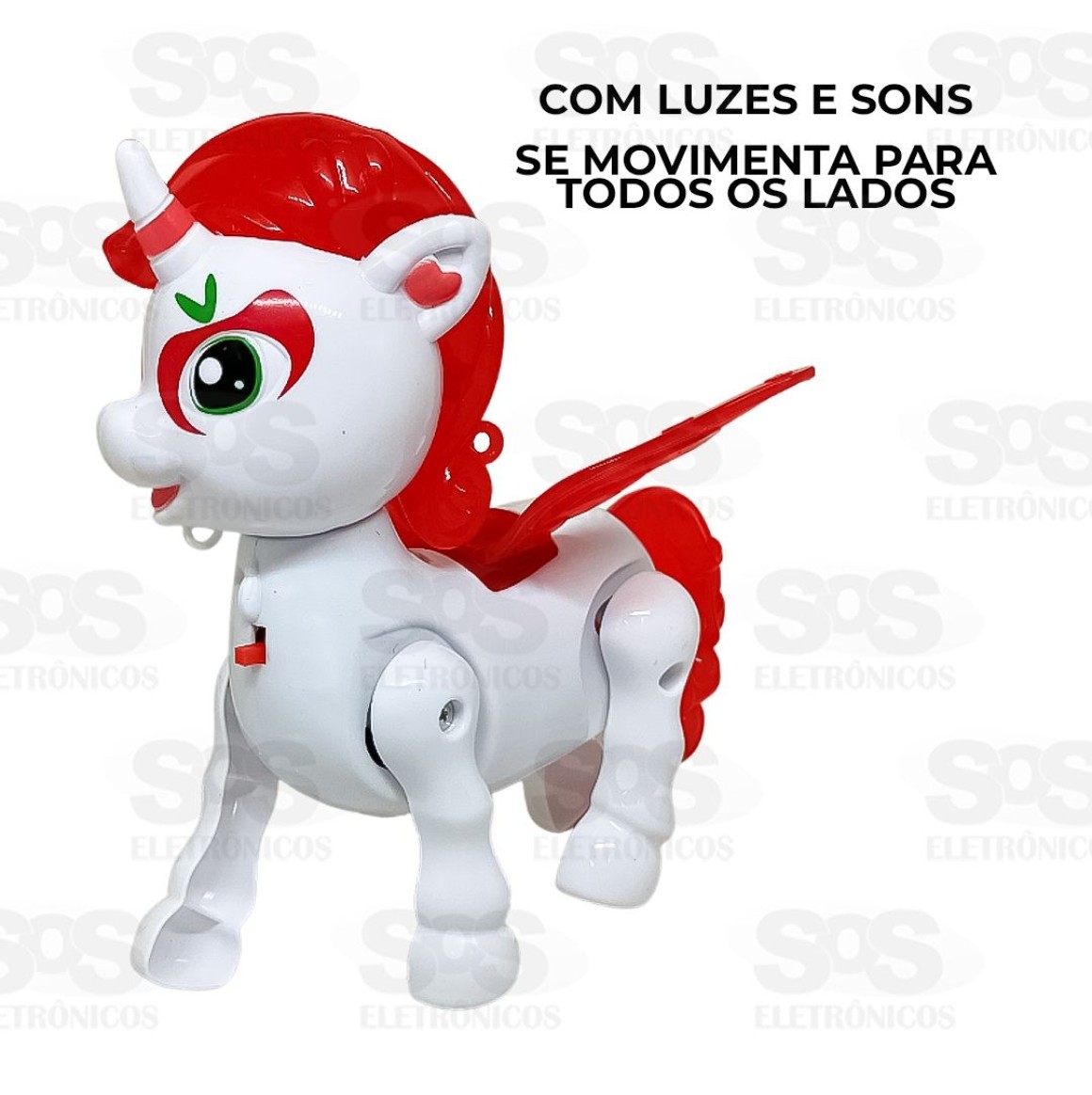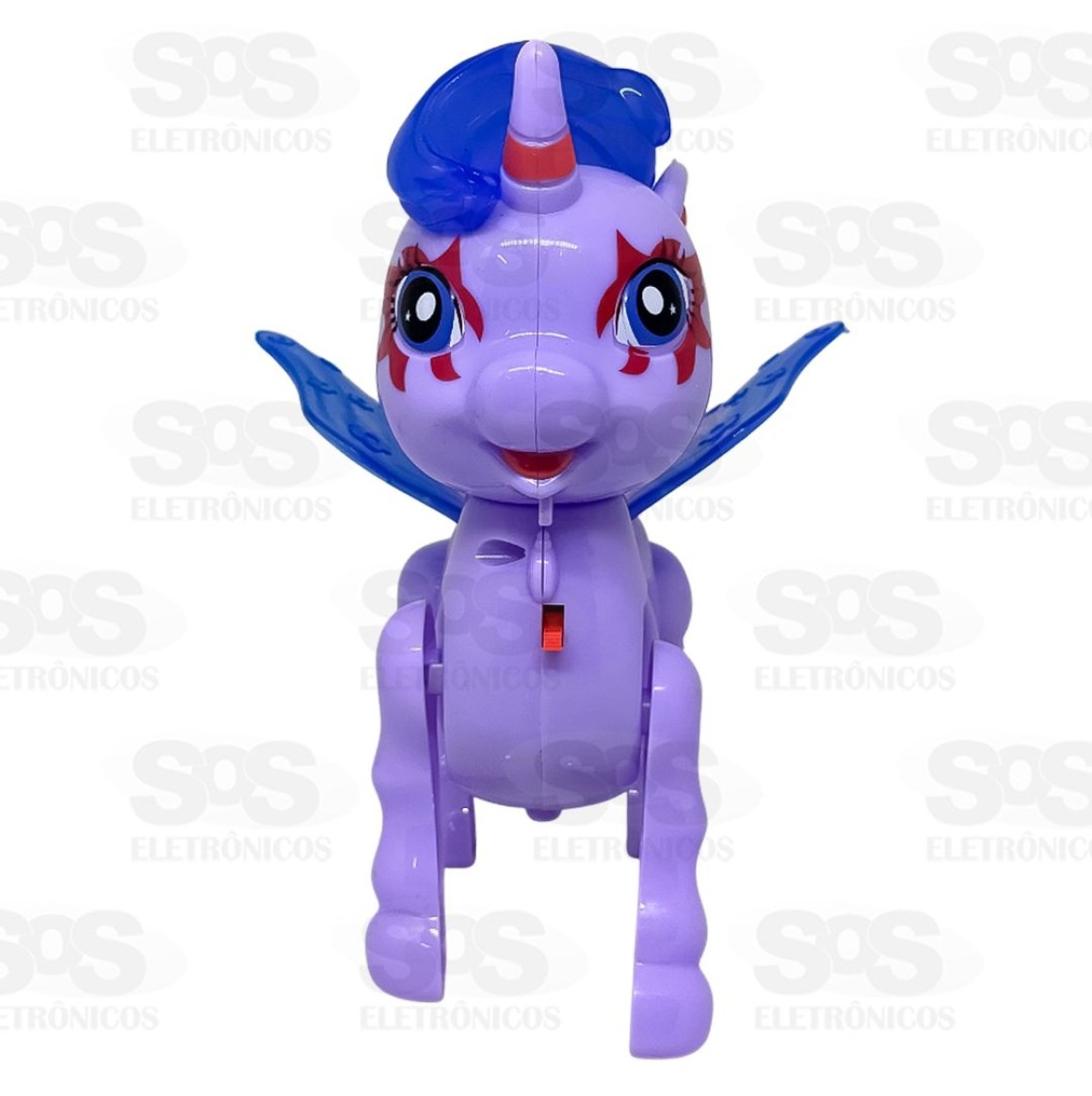 Unicórnio de brinquedo que se movimenta para todos os lados tocando musicas e acendendo luzes.